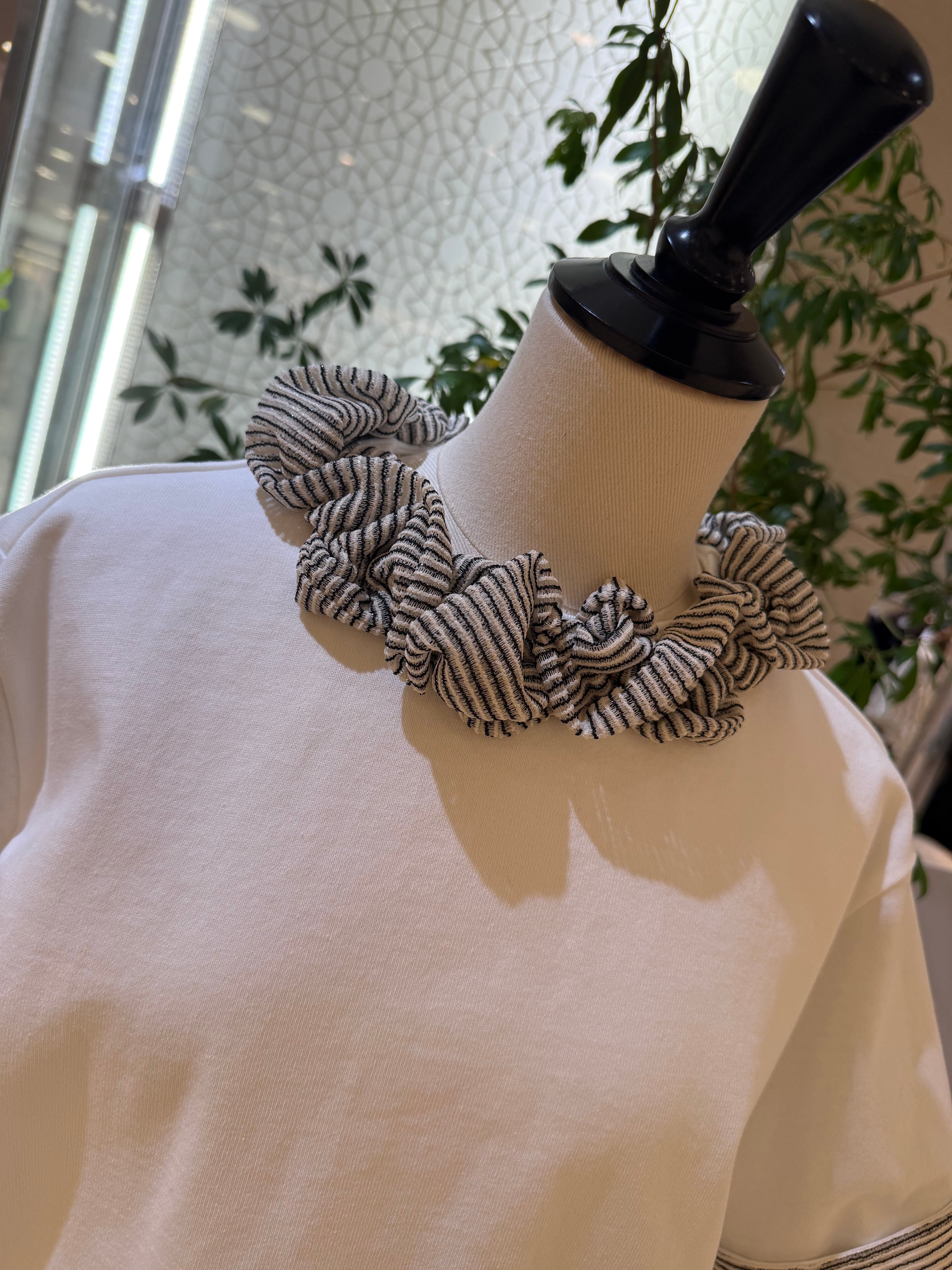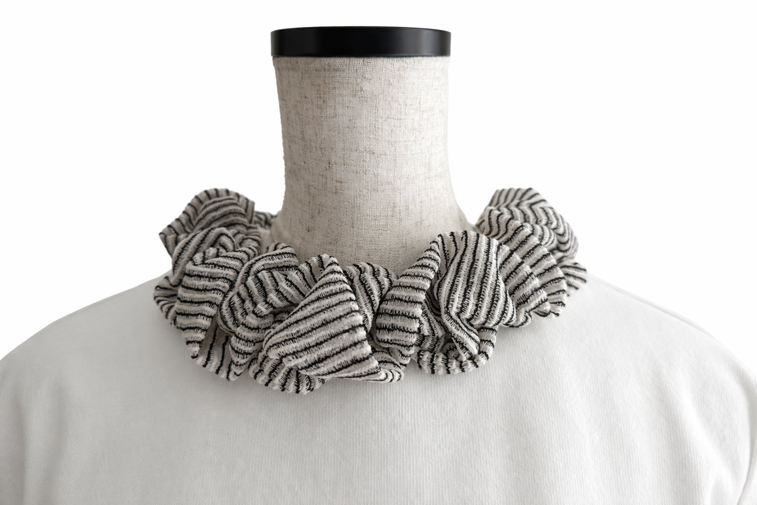そこへ白と黒のボーダー柄が特徴的なレースを使用して、首元には異素材のフリルを重ねることで、一枚でスタイリングが完成するデザインに仕上げました。