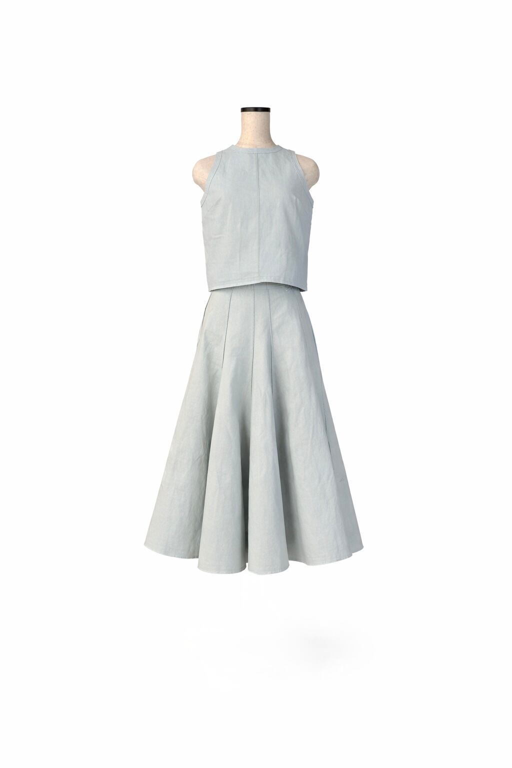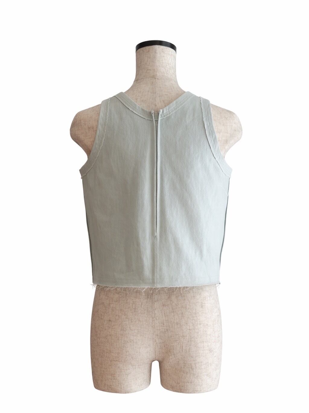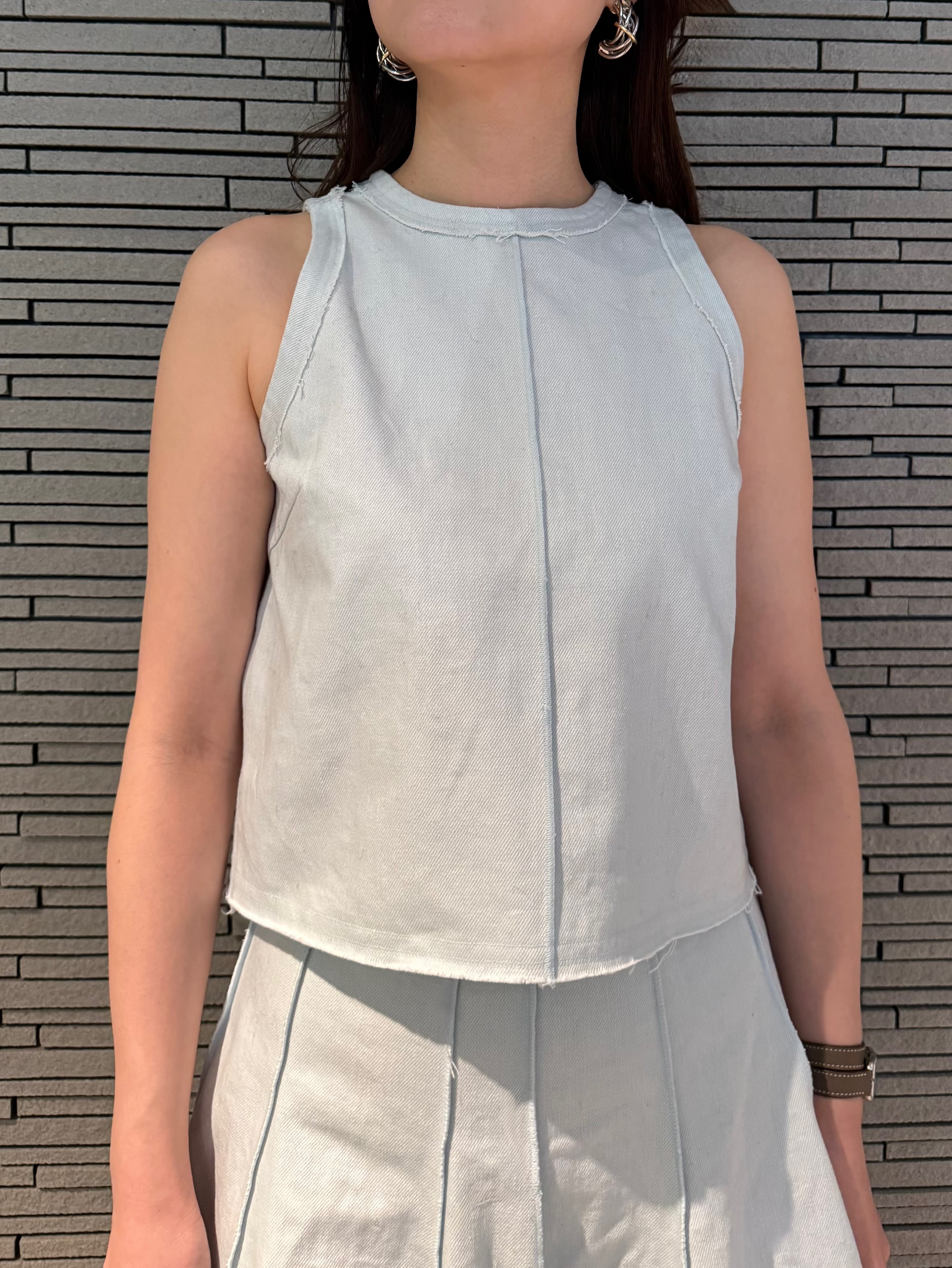 アイスブルーが特徴的なデニム地を使用したノースリーブトップス。別売りのスカートとのセットアップとして製作しました。すっきりとしたシルエットと、縦に入ったラインが身体をスリムに見せてくれるのが特徴で、重くなりがちなデニムスタイルが軽やかな印象に。裾にはさりげないほつれを施し、程よく抜け感も表現しました。春夏にTシャツの代わりとしても着用していただけるシンプルでありながらこなれた感を演出出来るトップスです。
