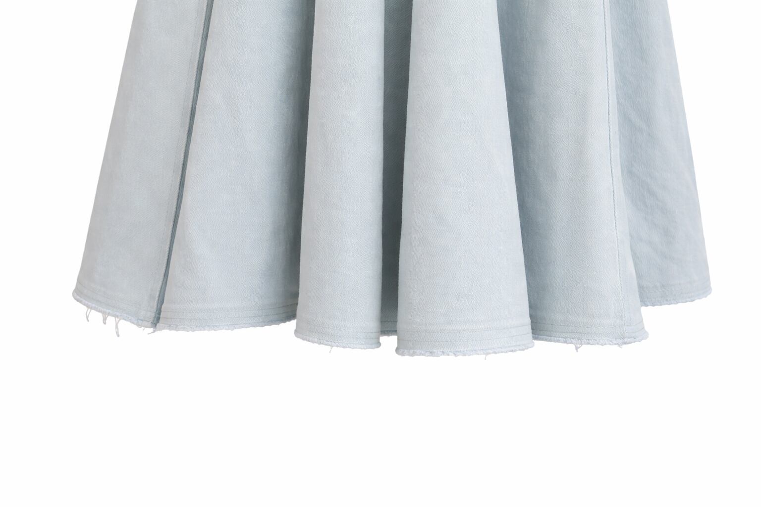 アイスブルーが特徴的なデニム地を使用したスカート。別売りの共生地のトップスとのセットアップとして製作しました。膝下丈で大人っぽく、そして12枚もの生地を接ぎ合わせてからだのラインを拾いにくいフレアシルエットです。裾にはさりげないほつれを施し、程よく抜け感も表現しました。セットアップでの着用はもちろん、シンプルなTシャツなどに合わせてもシンプルでありながらこなれた感あるコーディネートが完成します。