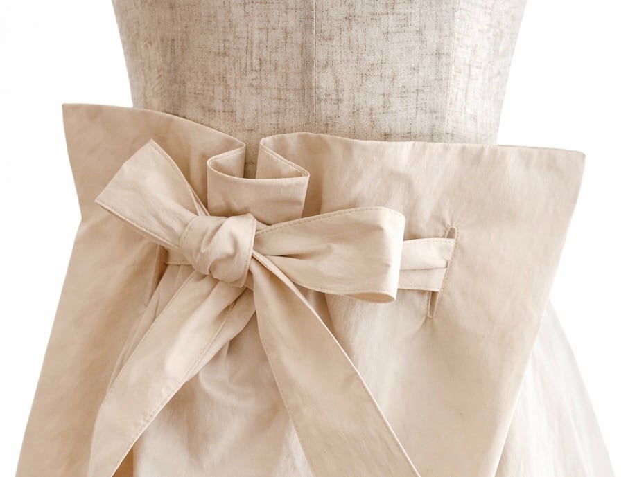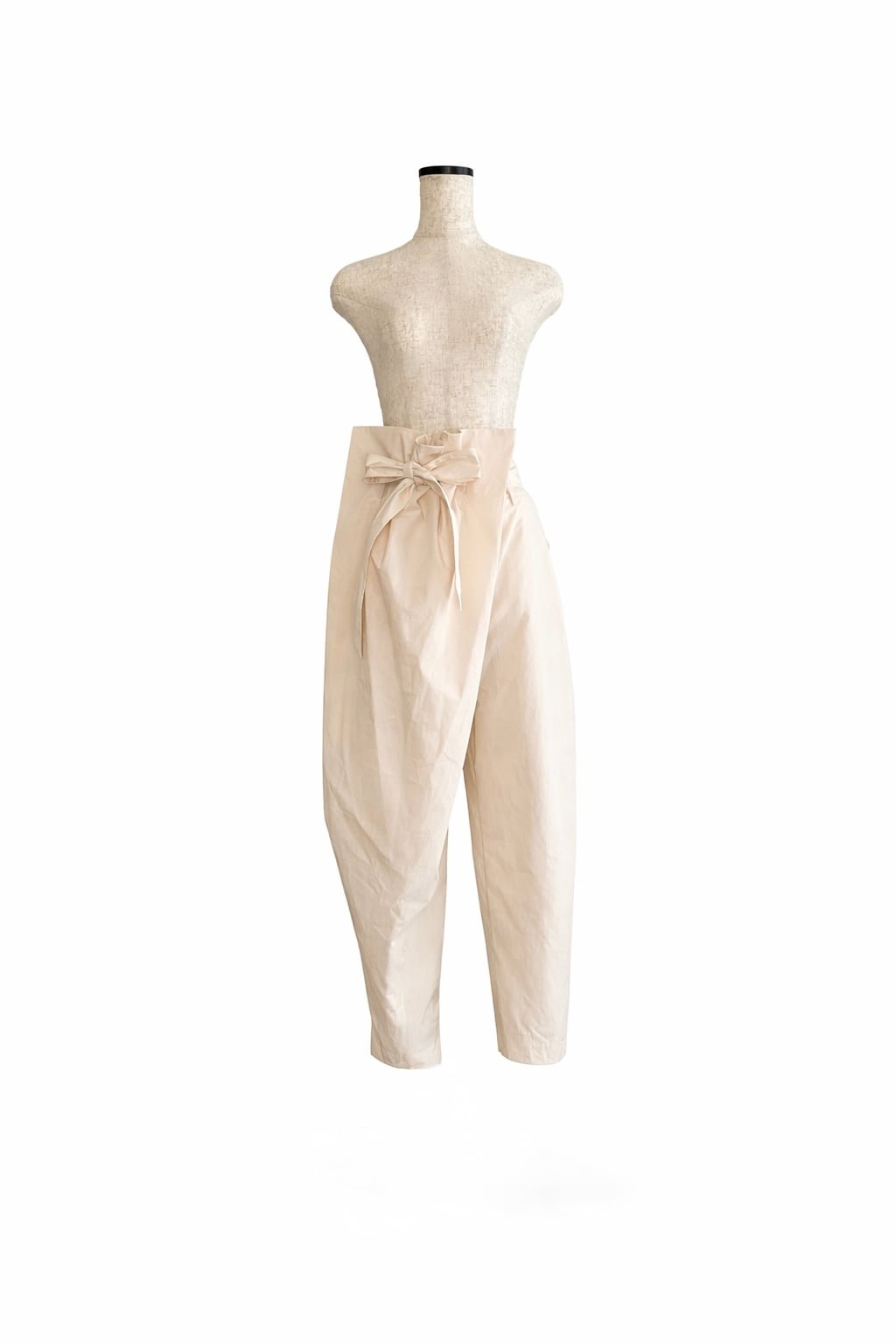 構築的なデザインが特徴のパンツを製作しました。ハイウエストで立体的なタックとラップ風のデザイン、ウエストのリボンがアクセントになっています。存在感があり、体のラインを拾いにくく、かつ動きやすくリラックス感もあります。程よいシワ感ある素材が特徴で、シンプルなトップスに合わせるだけでコーデイネートが完成するヘビーローテーション間違いなしのパンツが仕上がりました。裏地付きで透け感もありません。