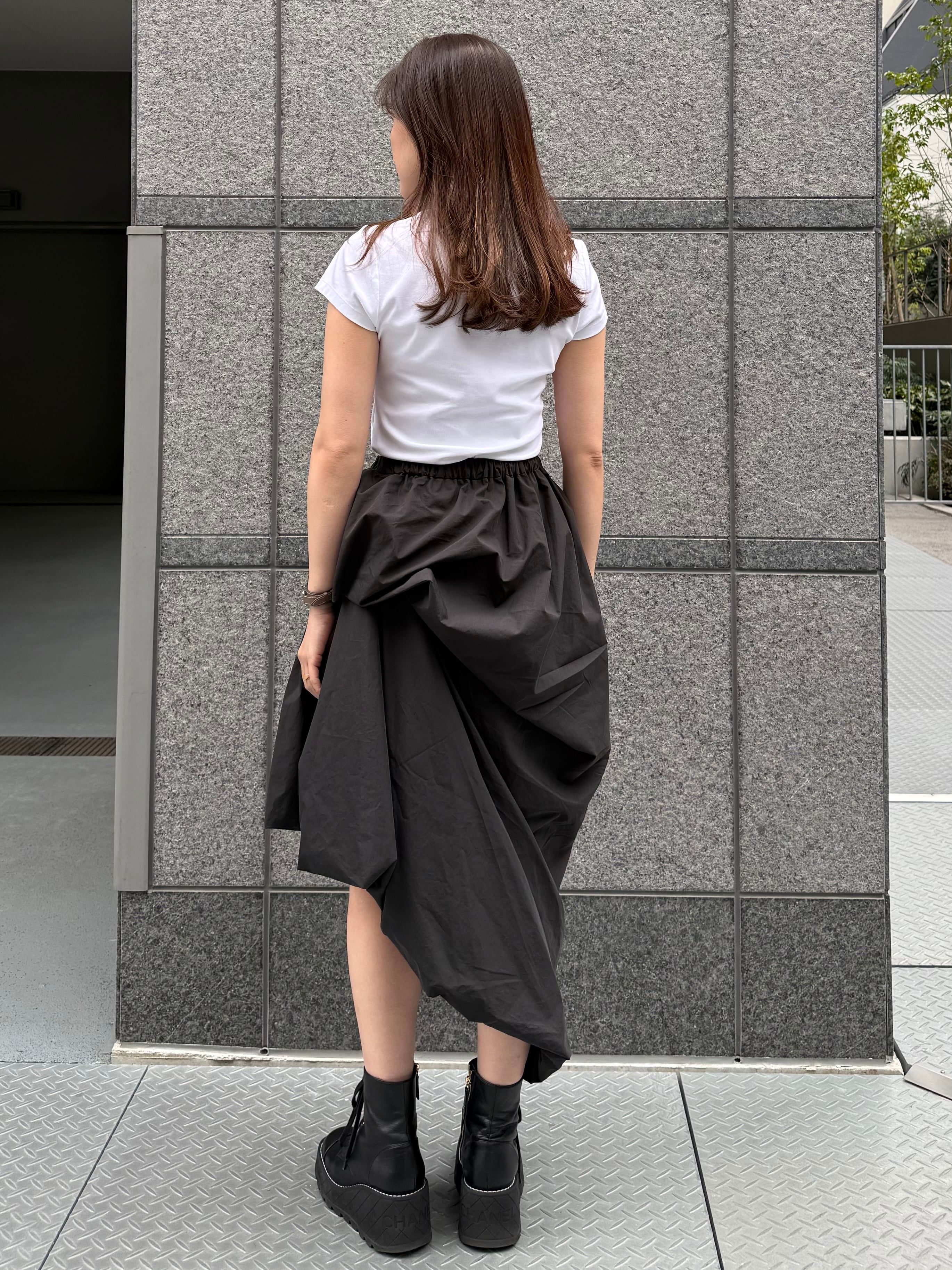 アシンメトリーに落ちるボリューム感が動きに表情を与え、シンプルなトップス合わせでもスタイリングが完成します。モードな存在感でありながら、軽やかな着心地も魅力な一枚です。
